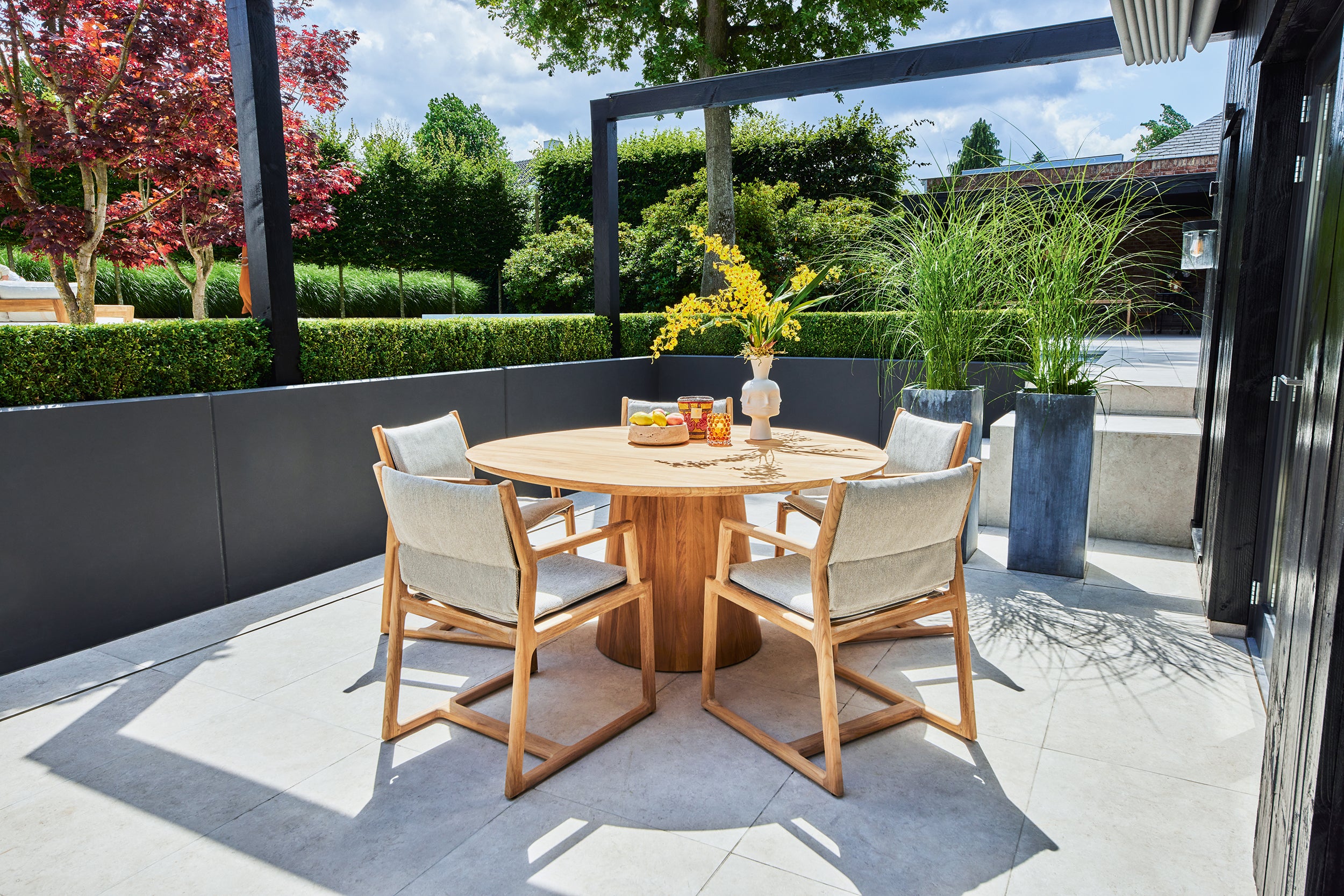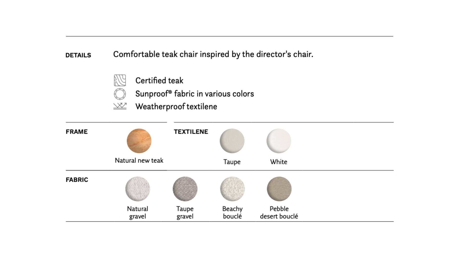 • White textilene: Voor een fris en modern contrast met het natuurlijke teakhout.