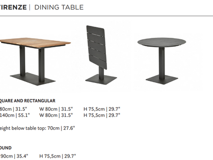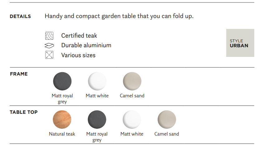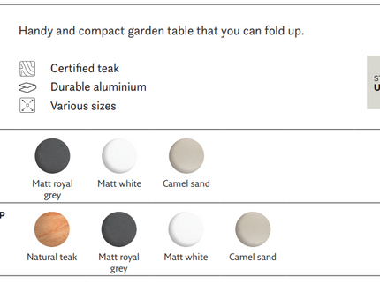 - Kies uit een tafelblad van hoogwaardig teak of duurzaam aluminium.