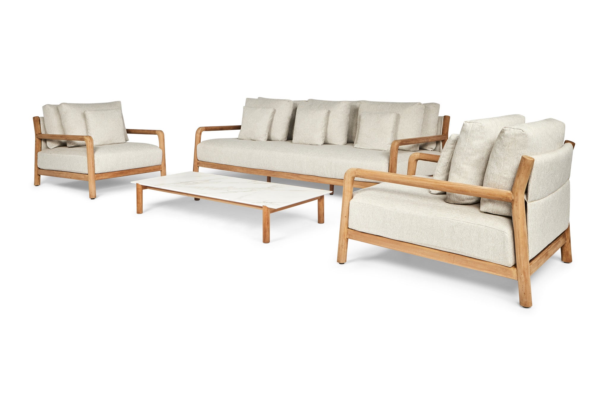 - Deze set bestaat uit een 3-zits loungestoel, 2x loungestoel en een salontafel met Neolith tafelblad