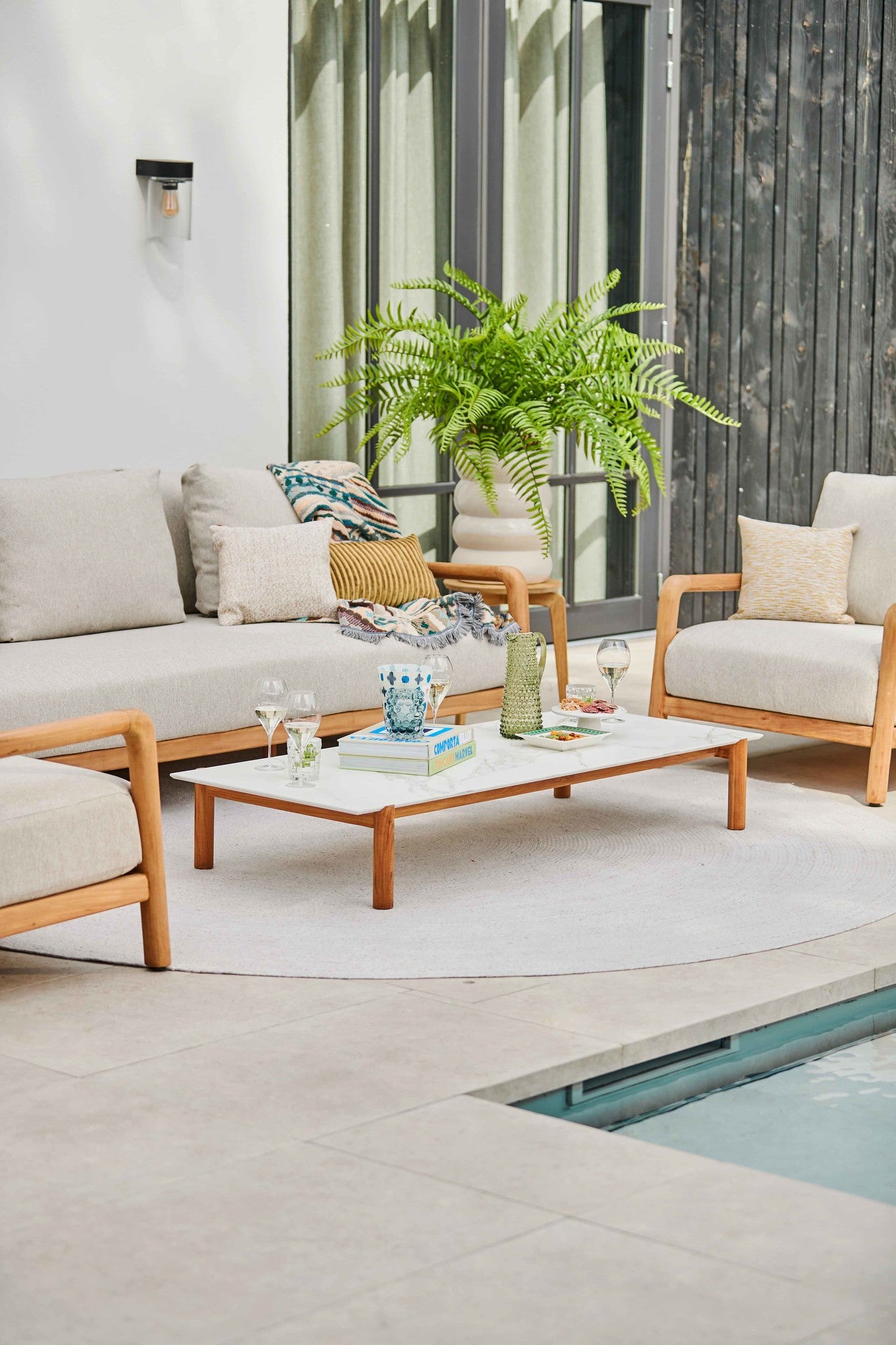 De Vittoria Sofaset is de loungeset wanneer je denkt aan comfort en luxe. Deze loungeset is volledig gemaakt van duurzaam en gecertificeerd teakhout, dit geeft deze set een prachtige luxe uitstraling! Deze set is een ultieme uitkomst voor heerlijke zomeravonden met vrienden en/of familie in de tuin. Maar is uiteraard ook uitermate geschikt voor een heerlijk avondje loungen op een doordeweekse avond met je gezin onder het genot van een heerlijk hapje en drankje.