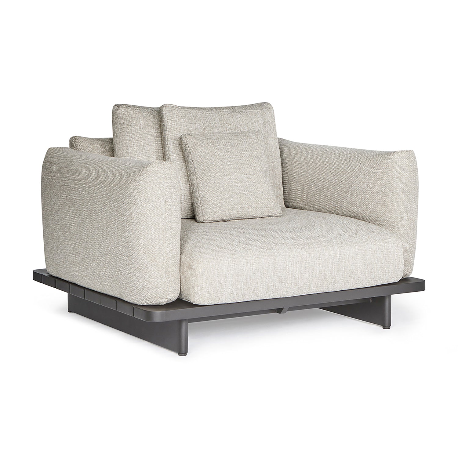 Het strakke aluminium frame vormt een krachtig contrast met de rijke kussenpartij en zorgt voor een moderne, luxe uitstraling. Dankzij het tijdloze ontwerp past de Volar lounge chair moeiteloos in zowel minimalistische als warme buitenruimtes.