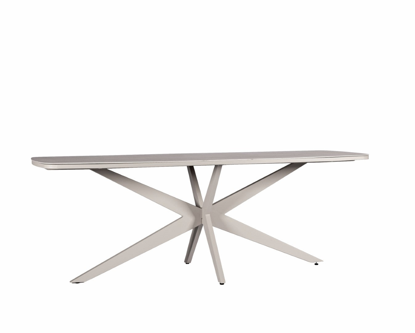 Het aluminium frame is verkrijgbaar in Salix, Bronze of Black en vormt een sterke, onderhoudsvriendelijke basis voor buitengebruik. Het tafelblad is uitgevoerd in travertin of slate, waarbij travertin zorgt voor een zachte, natuurlijke uitstraling en slate een strakker, moderner accent toevoegt.